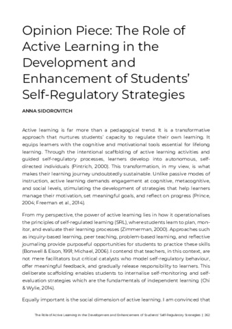 SIDOROVITCH, Anna (2026). Opinion Piece: The Role of Active Learning in the Development and Enhancement of Students’ Self-Regulatory Strategies. In: WILSON-MEDHURST, Sarah and HORROCKS, Janet, (eds.) Making Active Learning Happen for All. Brighton, Open Press University of Sussex, 262-264. [Book Section]