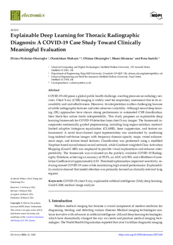 NICHOLAS-OMOREGBE, Divine, SHOBAYO, Olamilekan, OKOYEIGBO, Obinna, KHURANA, Mansi and SAATCHI, Reza (2026). Explainable Deep Learning for Thoracic Radiographic Diagnosis: A COVID-19 Case Study Toward Clinically Meaningful Evaluation. Electronics, 15 (7): 1443, 1-31. [Article]