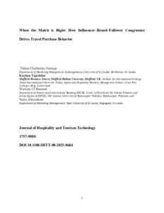 GAMAGE, Thilini Chathurika, TAJEDDINI, Kayhan, UL HAMEED, Waseem and ABEYSEKERA, Nalin (2026). When the match is right: how influencer–brand–follower congruence drives travel purchase behavior. Journal of Hospitality and Tourism Technology, 1-27. [Article]