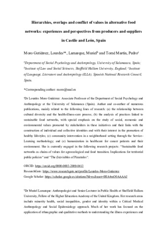 MORO GUTIÉRREZ, Lourdes, LAMARQUE, Muriel and TOMÉ MARTÍN, Pedro (2026). Hierarchies, overlaps and conflict of values in alternative food networks: experiences and perspectives from producers and suppliers in Castile and León, Spain. Food, Culture & Society, 1-22. [Article]