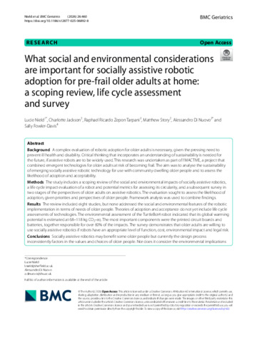 NIELD, Lucie, JACKSON, Charlotte, TARPANI, Raphael Ricardo Zepon, STORY, Matthew, DI NUOVO, Alessandro and FOWLER-DAVIS, Sally (2026). What social and environmental considerations are important for socially assistive robotic adoption for pre-frail older adults at home: a scoping review, life cycle assessment and survey. BMC Geriatrics, 26 (1): 460. [Article]