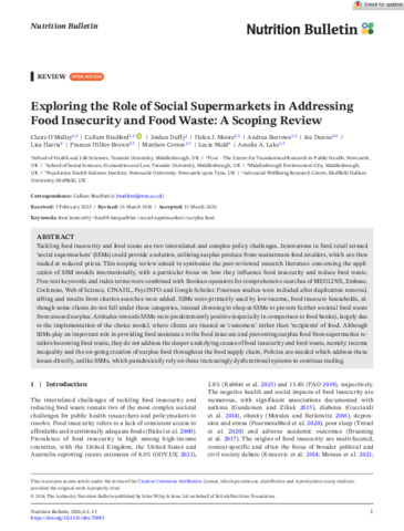O'MALLEY, Claire, BRADFORD, Callum, DUFFY, Jordan, MOORE, Helen J., BURROWS, Andrea, DUNNE, Joe, HARRIS, Lisa, HILLIER‐BROWN, Frances, COTTON, Matthew, NIELD, Lucie and LAKE, Amelia A. (2026). Exploring the Role of Social Supermarkets in Addressing Food Insecurity and Food Waste: A Scoping Review. Nutrition Bulletin. [Article]
