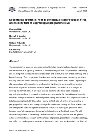 MILLER, Kirsty, MERDIAN, Hannah, BURKITT, William and MOSSOP, Liz (2025). Decentering grades in Year 1: conceptualising Feedback First, a feasibility trial of ungrading at programme level. Journal of Learning Development in Higher Education, 2025 (35). [Article]