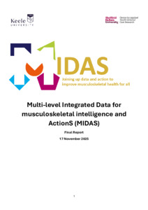 PEAT, George, HILL, Jonathan C, JORDAN, Kelvin P, YU, Dahai, THOMPSON, Claire, PARRY, Emma, BAILEY, James, STEVENSON, Kay, DZIEDZIC, Krysia S, WATHALL, Simon, GARVIN, Steff and LAWTON, Sarah (2025). Multi-level Integrated Data for musculoskeletal intelligence and ActionS (MIDAS). Final Report. Project Report. Keele University. [Monograph]