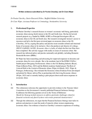 CHOWBEY, Punita and WIPER, Clare (2026). FIS0060 Written Evidence: Financial Inclusion Strategy submitted by Dr Punita Chowbey and Dr Clare Wiper. UK Parliament. [Other]