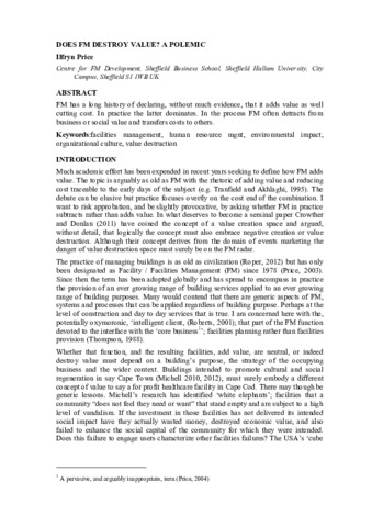 PRICE, Ilfryn (2012). Does FM destroy value? a polemic. In: CIB W70, Cape Town, Jan 2012. (Submitted) [Conference or Workshop Item]