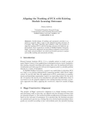 ANDREWS, Simon (2011). Aligning the teaching of FCA with Existing Module Learning Outcomes. In: ANDREWS, Simon, POLOVINA, Simon, HILL, Richard and AKHGAR, Babak, (eds.) Conceptual Structures for Discovering Knowledge : 19th International Conference on Conceptual Structures, ICCS 2011, Derby, UK, July 25-29, 2011. Proceedings. Lecture notes in computer science (6828). Springer, 394-401. [Book Section]
