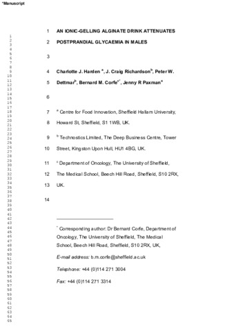 HARDEN, Charlotte, RICHARDSON, J Craig, DETTMAR, Peter W, CORFE, Bernard M and PAXMAN, Jenny (2012). An ionic-gelling alginate drink attenuates postprandial glycaemia in males. Journal of functional foods, 4 (1), 122-128. [Article]
